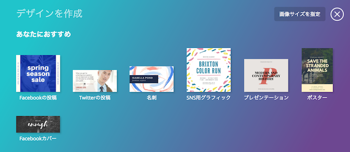Canvaには最初から豊富なテンプレートが用意されていて、名刺やポスターはもちろんSNS用イメージの作成も簡単に行なえます。