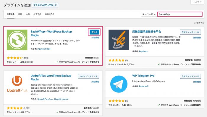 「プラグイン > 新規追加」から「BackWPup」を検索してインストールします。